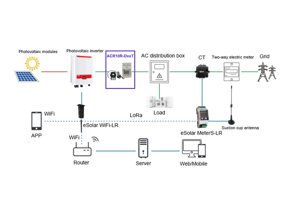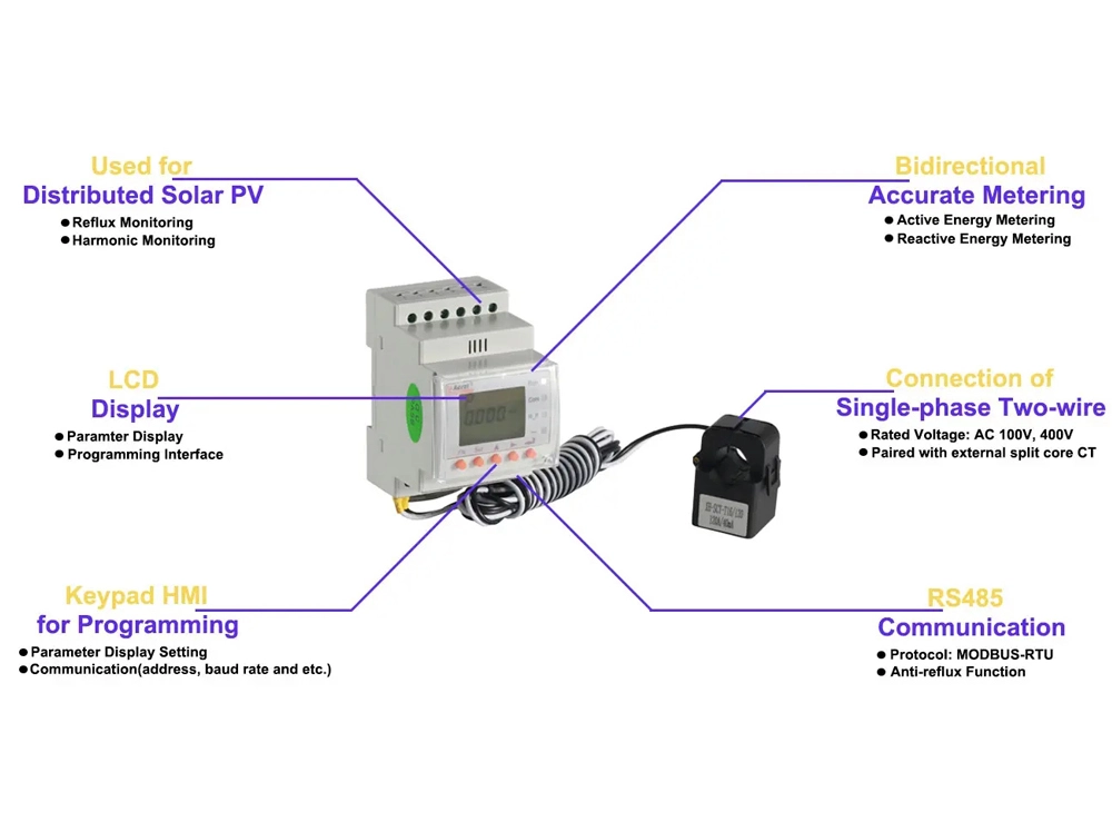 ACR10R-D16TE PV inverter meter with power monitoring is suitable for energy-saving renovation projects in high-energy-consuming industries such as smelting, steel, electric welding, and semiconductors. It is also suitable for power monitoring and power demand-side management of distributed photovoltaic grid-connected cabinets. It integrates the measurement of all power parameters (such as single-phase current, voltage, active power, reactive power, apparent power, frequency, power factor), as well as power monitoring and assessment management.