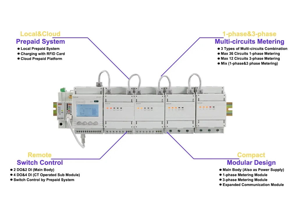 ADF400L series multi-user electric energy meters can achieve up to 12 channels of three-phase or 36 channels of single-phase direct access measurement or 12 channels of three-phase transformer access measurement through module combination, and support direct access and transformer access hybrid Measurement method, this series of electric energy meters is favored by communities, schools, enterprises, etc. due to its advantages of high accuracy, centralized installation, centralized management, high installation flexibility, and mutual non-interference. This series of meters supports the prepaid function.