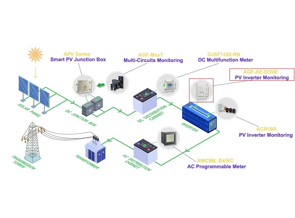 AGF-AE-D Solar Inverter Energy Meter is suitable for energy-saving renovation projects in high-energy-consuming industries such as smelting, steel, electric welding, and semiconductors. It is also suitable for power monitoring and power demand-side management of distributed photovoltaic grid-connected cabinets. It has the characteristics of no need to disassemble the busbar once, simple and convenient wiring, safe construction, saving transformation costs and improving efficiency for users.