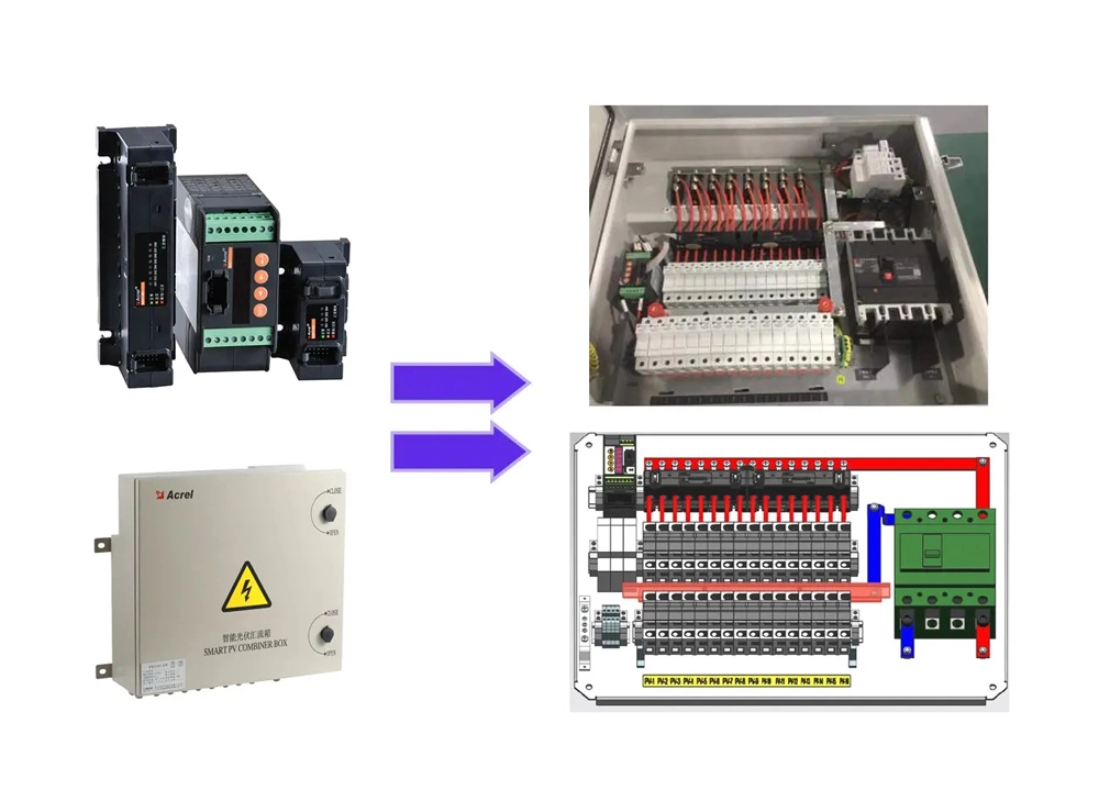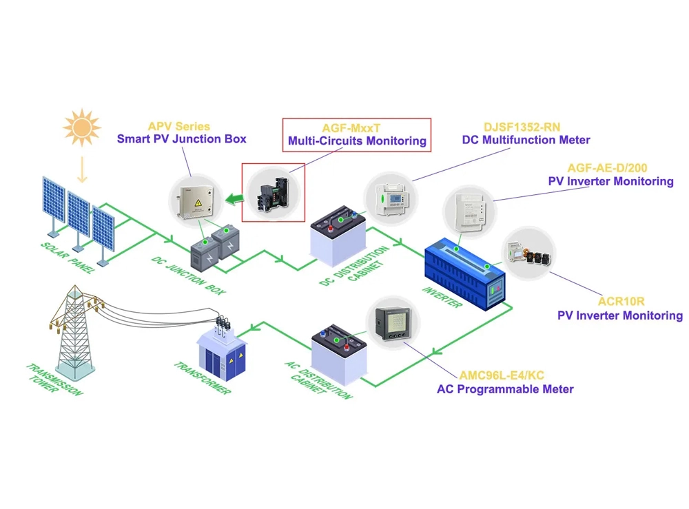 The intelligent photovoltaic confluence box specifically uses the AGF-M12T solar PV DC string monitoring device to keep track of the state of the photovoltaic cell array's operation. It has the ability to measure the photovoltaic cell current, gather data on the state of the confluence box's lightning protection device, the DC circuit breaker, and the relay contact output. The device features an RS485 interface with sensor interfaces for wind speed, temperature, and irradiance meter to upload the measured and gathered data as well as equipment status.