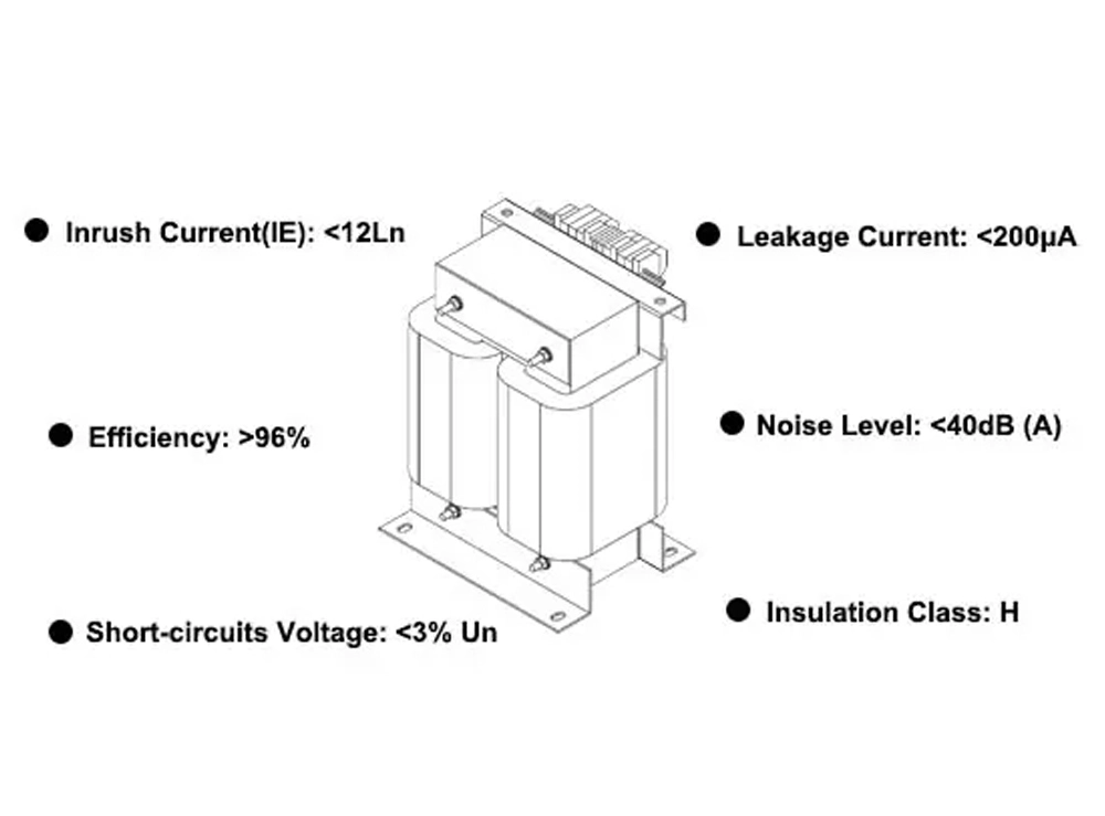AITR series isolation transformers are used in medical IT systems. The iron core is made of silicon steel sheets imported from Japan, and the loss is very small. The windings are double-insulated and equipped with an electrostatic shielding layer, which reduces the electromagnetic interference between the windings. A PT100 temperature sensor is installed in the wire package to monitor the temperature of the transformer. The whole is treated with vacuum impregnation paint, which increases the mechanical strength and corrosion resistance. The product has good temperature rise performance and low noise.