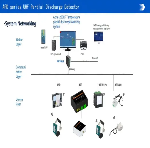 The APD series high-voltage switchgear partial discharge monitoring device detects the electromagnetic wave radiation generated along with partial discharge and automatically determines the actual detection frequency of on-site partial discharge. Then, data such as the number and frequency of partial discharge detected are uploaded to the server.