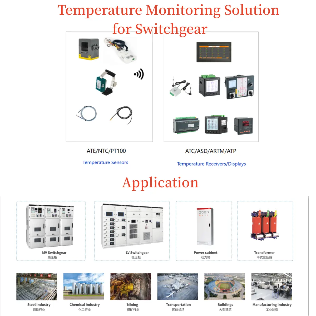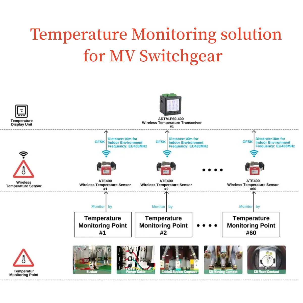 ATE400 Switchgear Temperature Monitoring Sensor is suitable for 3-35kV indoor switchgears, including built-in switchgears, handcart switchgears, fixed switchgears and loop-net switchgears. It is also suitable for 0.4kV low-voltage switchgears such as fixed switchgears and drawer switchgears. The wireless temperature sensors can be installed at any heating point in switchgears, the device utilizes the wireless data transmission technology for real-time transmission of monitored temperature data. In addition, it can be transmitted to display device or remote intelligent monitoring system.