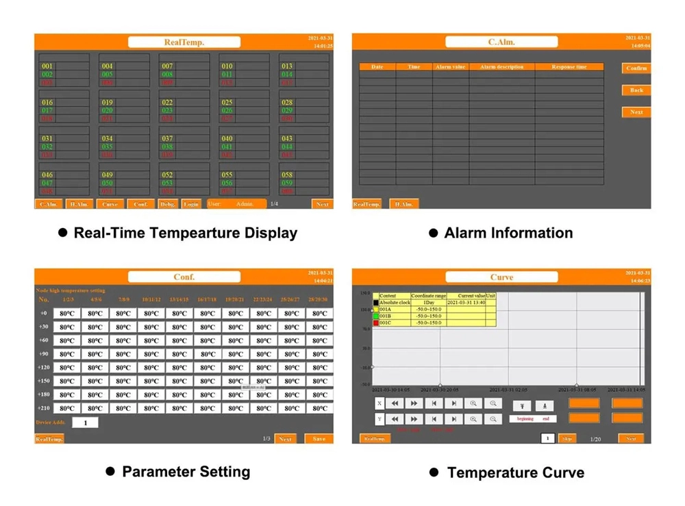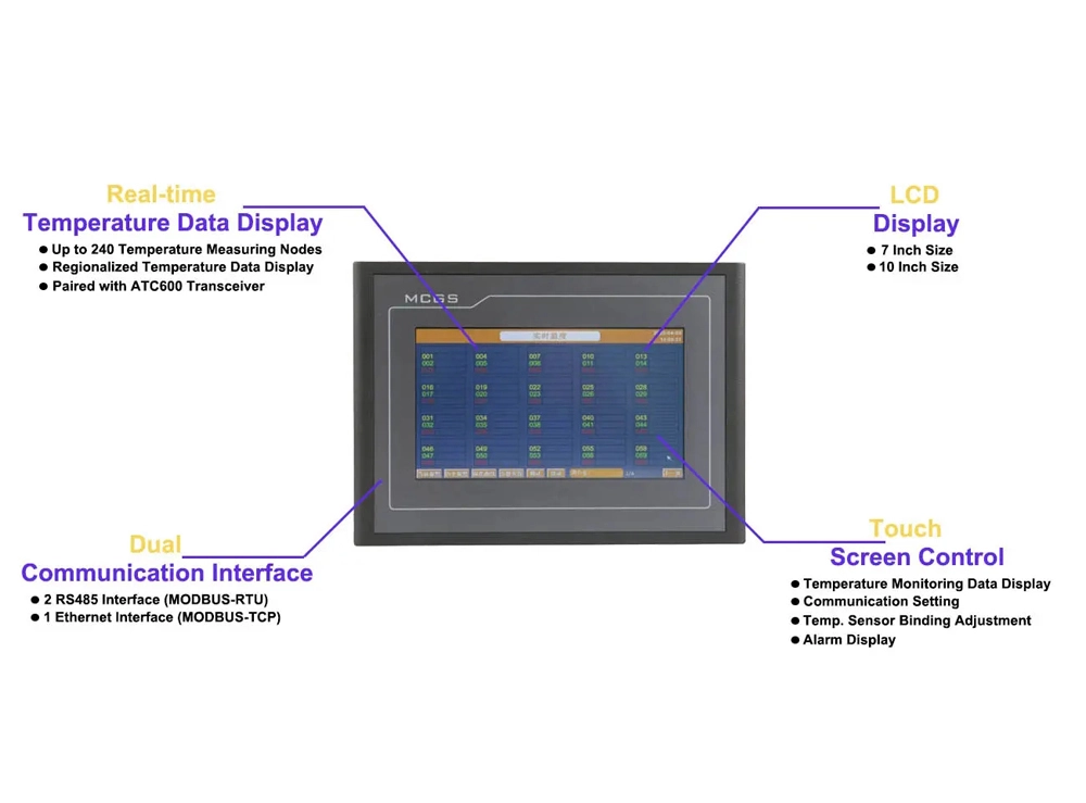 ATP series wireless temperature measurement centralized acquisition touch screen is suitable for temperature monitoring of high-voltage switch cabinet contacts and contacts, knife switch, high-voltage cable intermediate head, dry-type transformer, low-voltage and high-current equipment. The touch screen can be used in conjunction with a wireless temperature measurement transceiver to achieve data collection of 240 wireless temperature measurement sensors. The matching sensors include ATE100M, ATE100, ATE200, ATE100P, ATE200P, ATE400, etc.