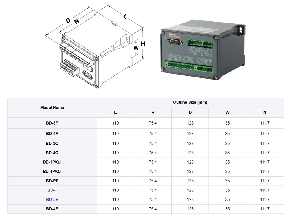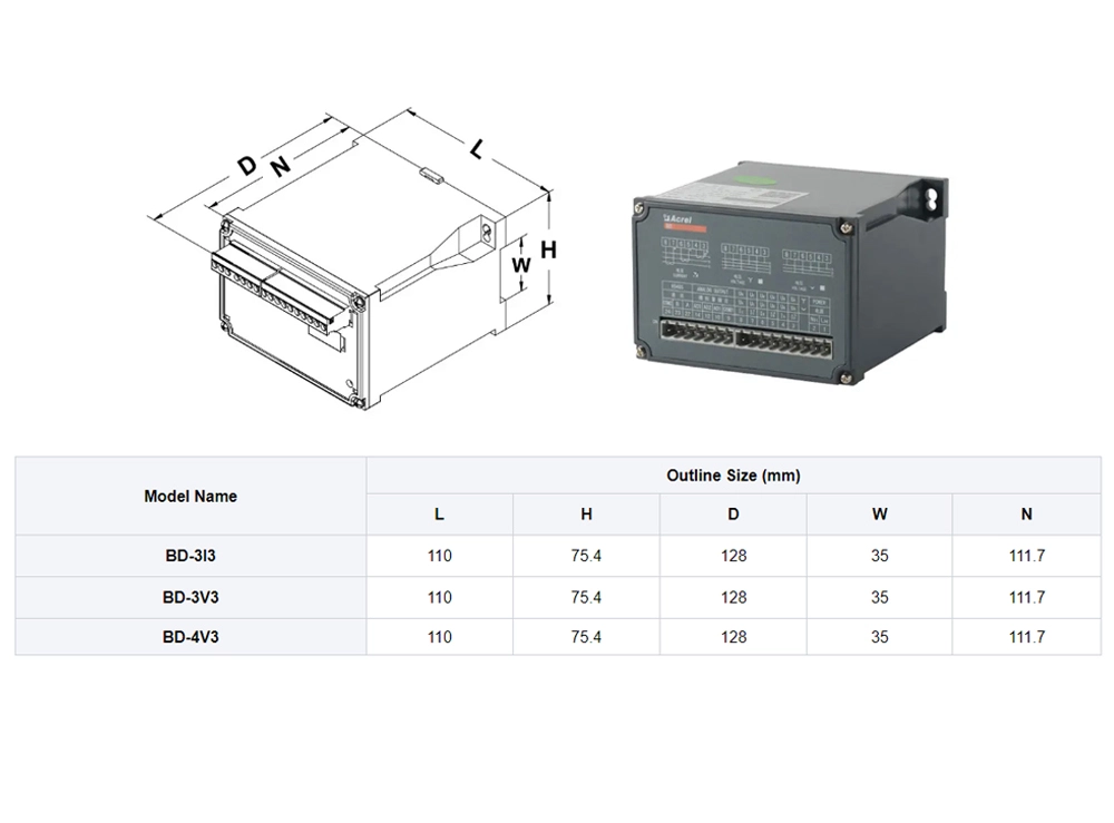 The BD-3E multi-function transducer from Acrel has temperature coefficient of 200ppm/°C, reaction time of 400ms, and accuracy class of 0.5%. It can be mounted using a 35mm DIN rail or screw fixation and runs on an auxiliary power supply of 85V–265V AC, 100V–350V DC, or 24V–48V DC (for some variants).
